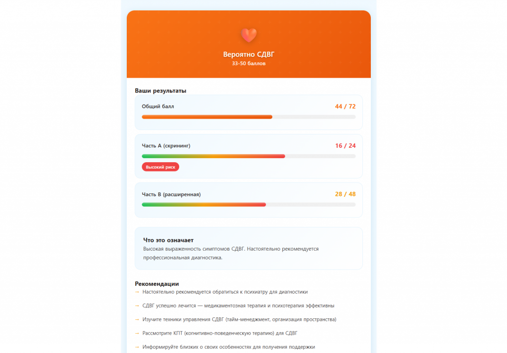 Вот что важно понимать: ASRS — это не диагноз. Ни один опросник не заменит клинического заключения. Это скрининг — инструмент, который помогает определить, стоит ли обращаться к специалисту. Если результат высокий, следующий шаг — консультация психиатра, который проведёт клиническое интервью (в идеале с использованием DIVA-5, «золотого стандарта» диагностики с точностью 92%) и оценит, действительно ли речь идёт о СДВГ или о чём-то другом.