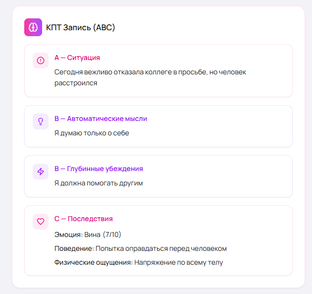 Процесс ведения КПТ дневника с поддержкой ИИ становится менее похожим на заполнение сложного рабочего листа и более — на разговор с понимающим, непредвзятым собеседником.