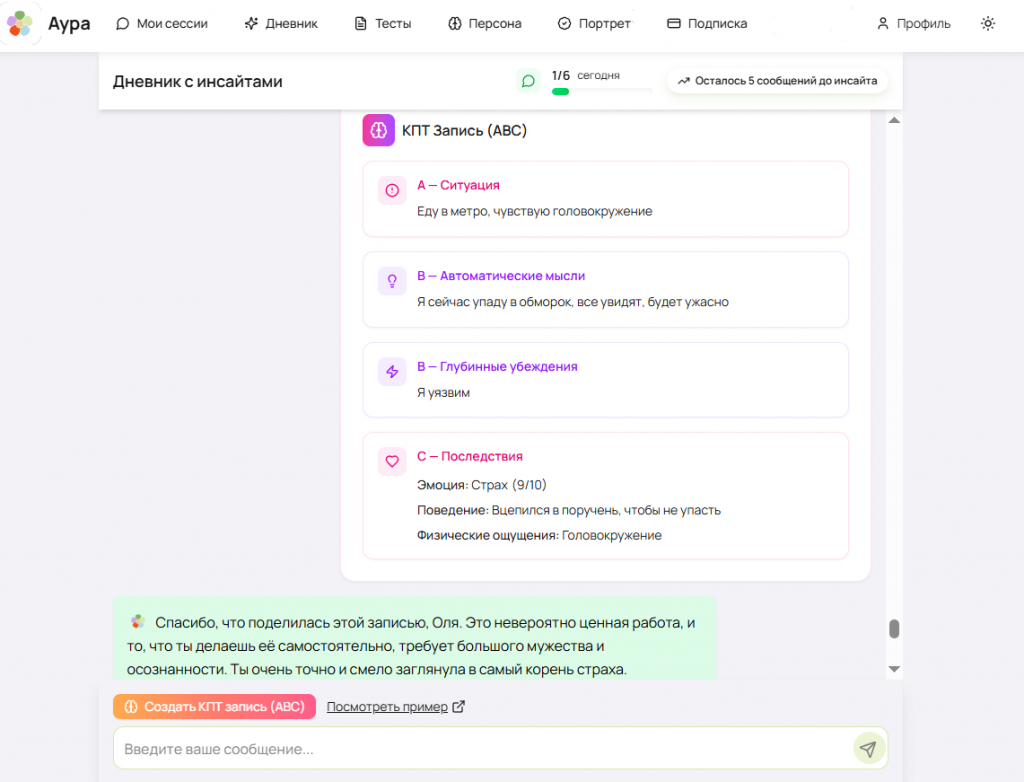 - Работа с ИИ-психологом. Платформа Аура может стать вашим ежедневным помощником в применении техник КПТ, отслеживании прогресса, проработке автоматических мыслей.