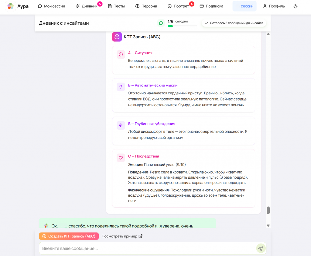 Терапевтический ИИ-ассистент Аура использует техники КПТ, адаптированные для работы с тревожными и соматическими симптомами. Структурированный подход помогает выявлять автоматические мысли, проверять их соответствие фактам и модифицировать паттерны реагирования.